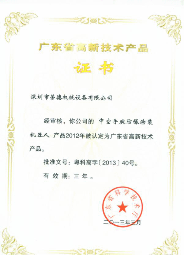 日前,廣東省科技廳公示了獲得“2012年廣東省高新技術(shù)產(chǎn)品證書”的企業(yè),深圳市榮德機器人科技自主研發(fā)的噴涂機器人赫然在目。