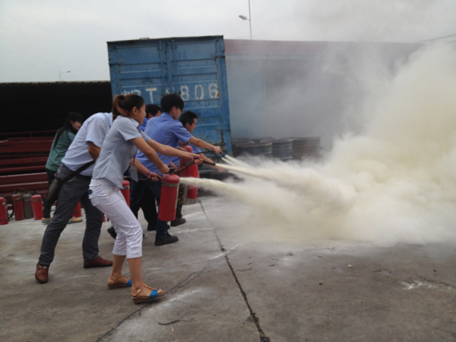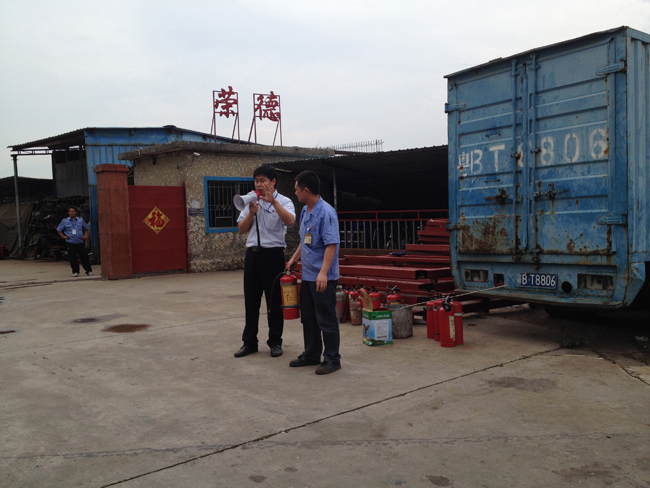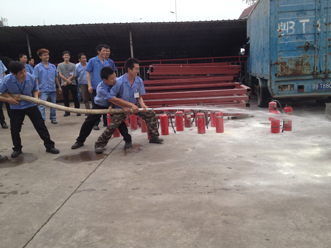 2、消防知識培訓。等大家集中到了廠外安全區域后,由義務消防隊人員對全員進行滅火器材的使用方法。主要是干粉滅火器和消防栓的使用。安全主任謝京亮邊講解邊模擬使用傳授給所有員工滅火器的使用步驟:搖一搖、拔下插銷、瞄準火焰根部、壓下把手、來回掃射。