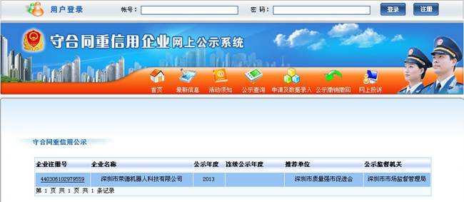 近日,廣東省工商行政管理局向社會(huì)公示了全省“守合同重信用”企業(yè)名單,深圳市榮德機(jī)器人科技有限公司喜獲上榜,首次榮獲該榮譽(yù)稱號。