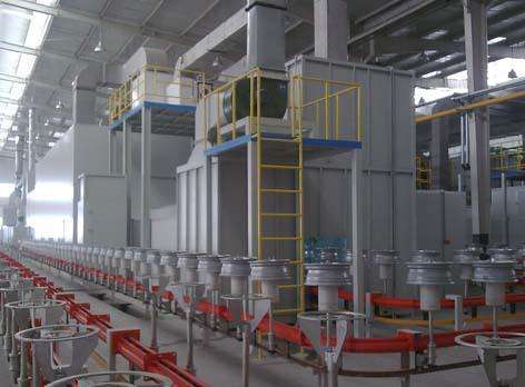 涂裝生產(chǎn)線主要工藝流程是上件→拋丸除銹→清理吹灰→噴鋁→底漆噴漆流平→底漆烘干→中涂噴漆流平→中涂烘干→面漆噴漆流平→面漆噴漆烘干→下件。涂裝線的防腐環(huán)境是室外(不直接淋雨),高架橋腹部波紋板。保護(hù)年限為長效型,50年。主要針對工廠構(gòu)件外表面涂漆,不考慮施工后涂裝。前處理拋丸,Sa3.0級、粗糙度/75-120um、清潔度/1級。基材涂層為電弧熱噴鋁,120-150μm;底涂層為環(huán)氧富鋅底漆,60-80μm,90℃60分鐘烘干。中間涂層為環(huán)氧云鐵中間漆,150-180μm;90℃90分鐘烘干。 面漆為丙烯酸聚氨酯或氟碳漆面漆,40-60μm。90℃60分鐘烘干。總漆膜厚度:≥250μm。