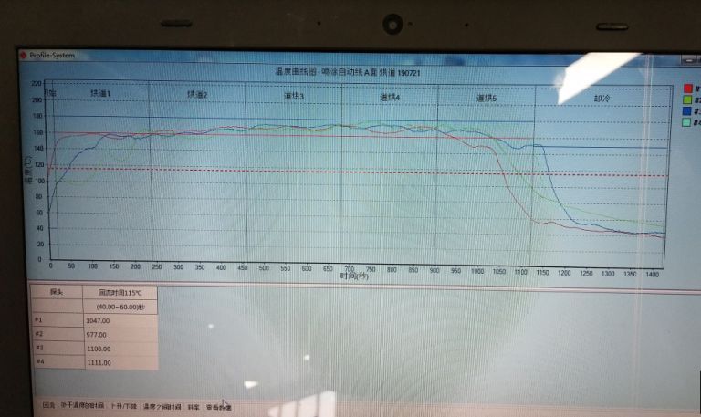 a噴涂生產線測溫 預熱設定120℃ ,烘烤5分鐘后溫度在90-120左右 ,沒有在±5的溫度范圍內,烘干線5節烤箱都設定170℃ ,只有 234節烤箱烤箱基本能在160-175這個溫度范圍內,沒有在總烘烤時間設定15分鐘, 需有12分鐘在165-175這個時間段內 b線測溫第一二節烤箱。