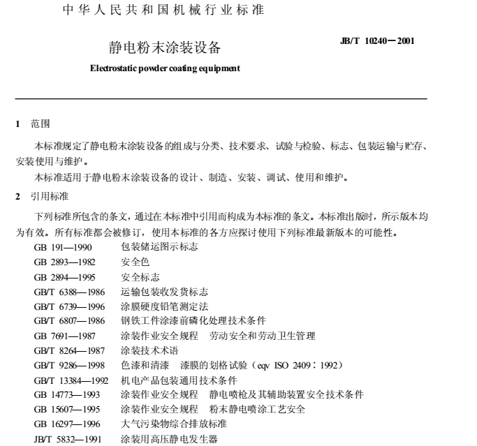 噴涂行業標準《靜電粉末涂裝設備》JB-T10240-2001